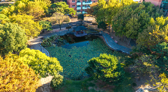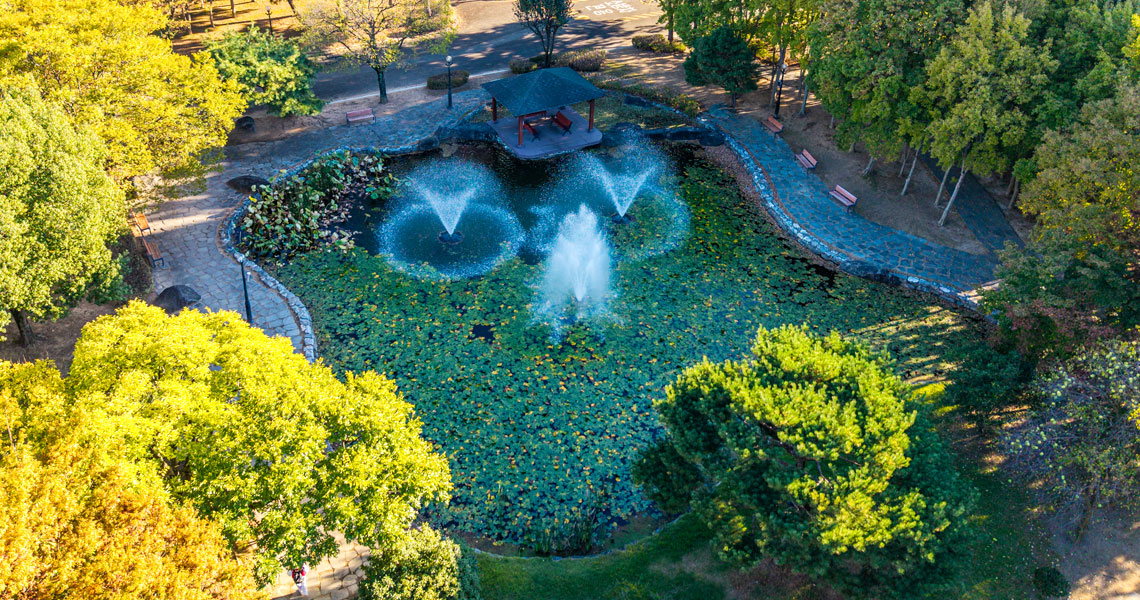 연못 주변에는 산책로와 휴식 공간이 마련되어 있어 잠시 머물며 여유를 즐기기에 좋습니다.