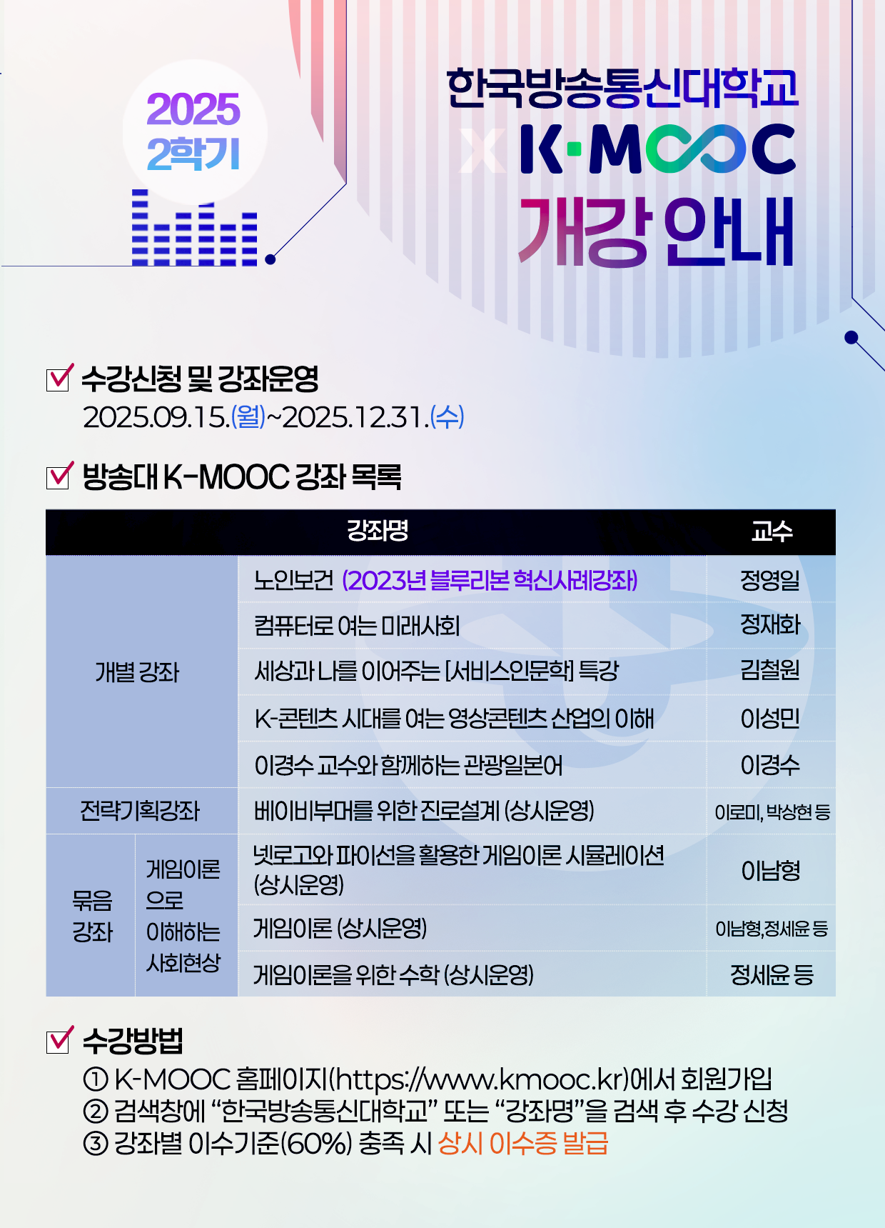 4079 | 2025학년도 한국형 온라인 공개강좌(K-MOOC)수강 안내(한국방송통신대학.. | 원격교육지원센터 | 2025/10/02 | 55 | |