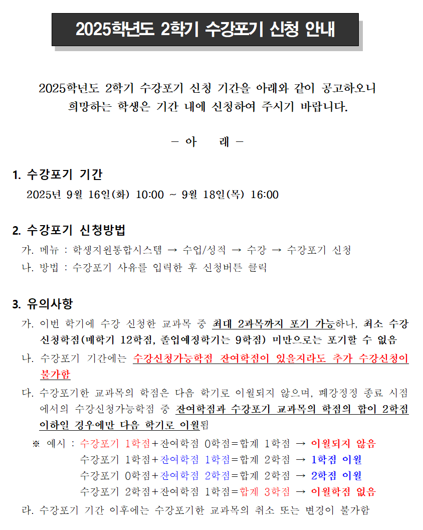 | 1288 | 2025학년도 2학기 수강포기 신청 안내 | 수업학적팀 | 2025/09/12 | 6837 | |