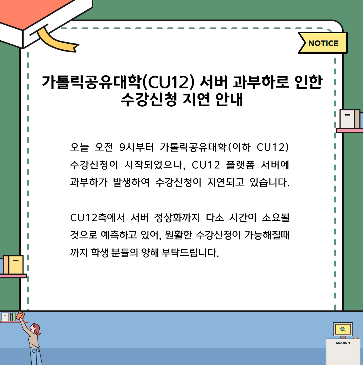 | 1329 | 가톨릭공유대학(CU12) 서버 과부하로 인한 수강신청 지연 안내 | 수업학적팀 | 2026/01/19 | 14461 | |