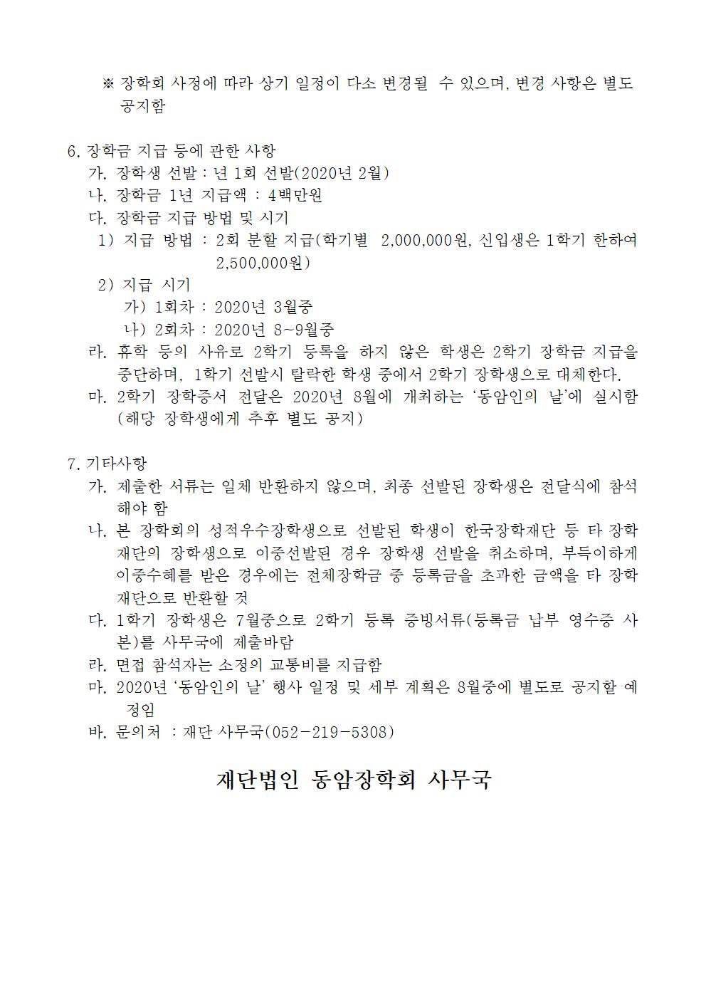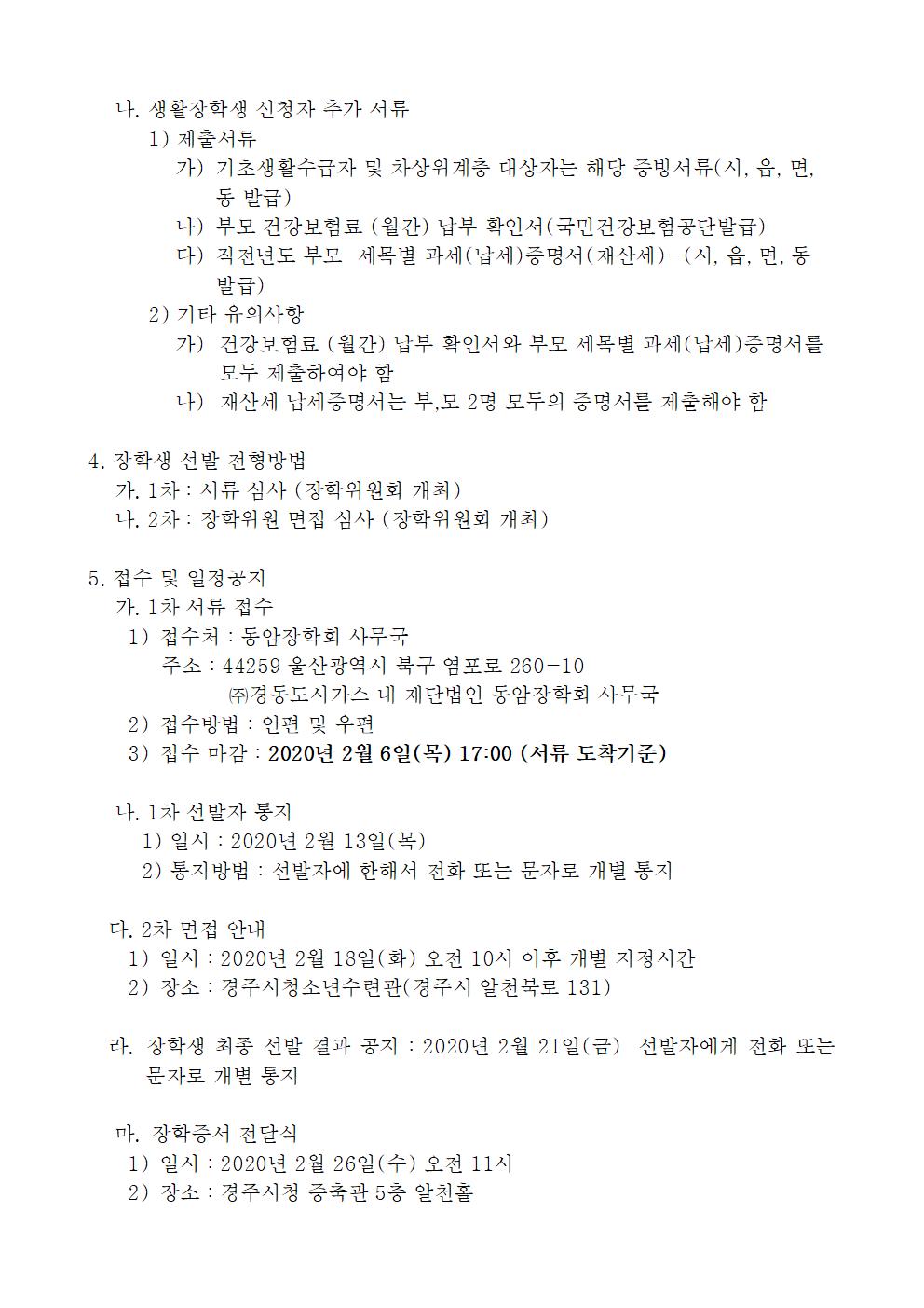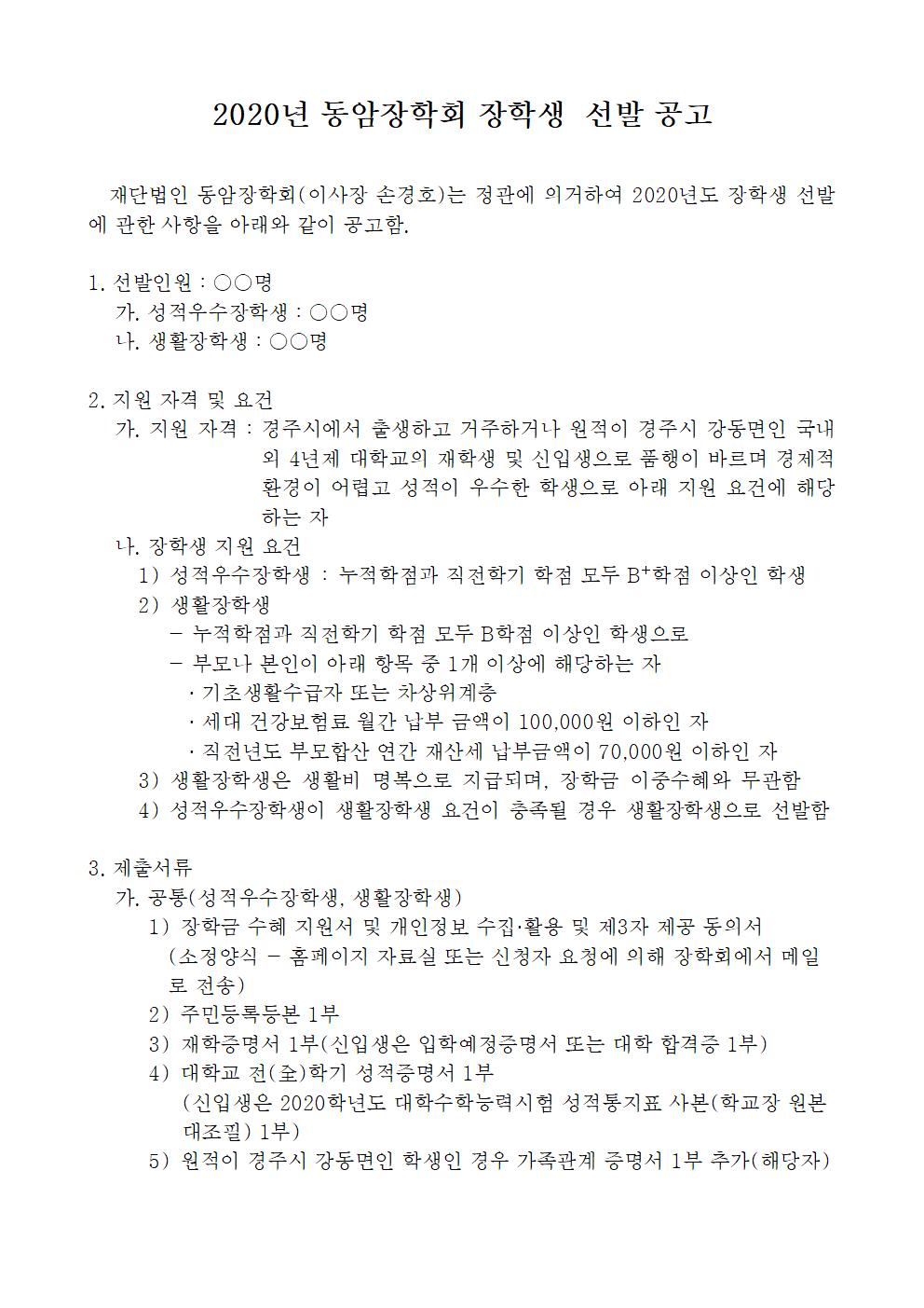 2020년 동암장학회 장학생 선발 공고(경주시 출생거주자 또는 원적 경주시 강동면)
