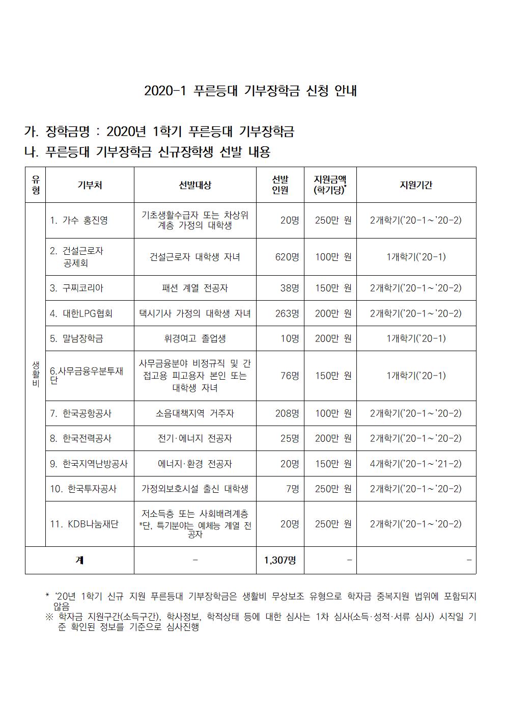 2020-1 푸른등대 기부장학금 신청 안내