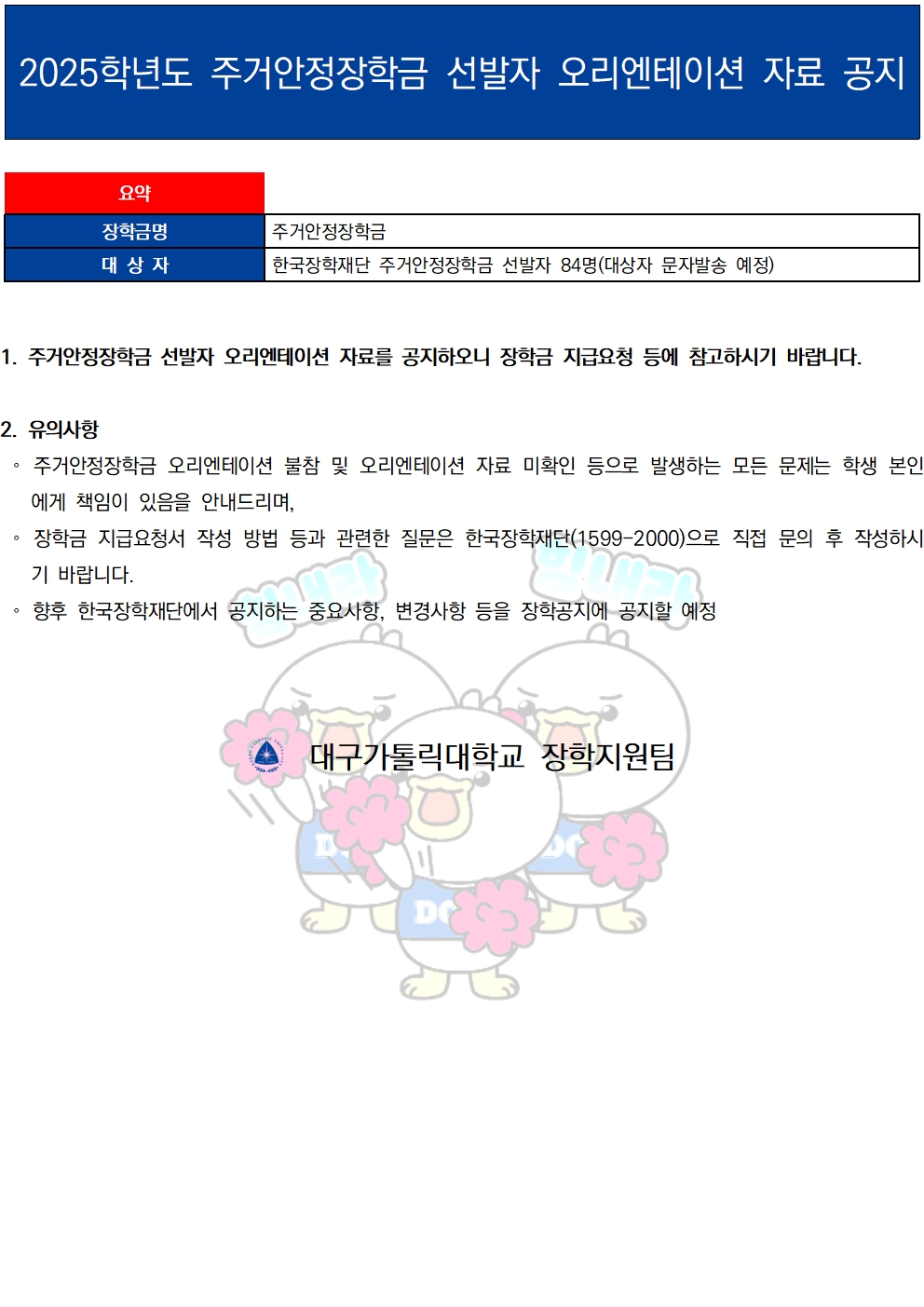 2025학년도 주거안정장학금 선발자 오리엔테이션 자료 공지