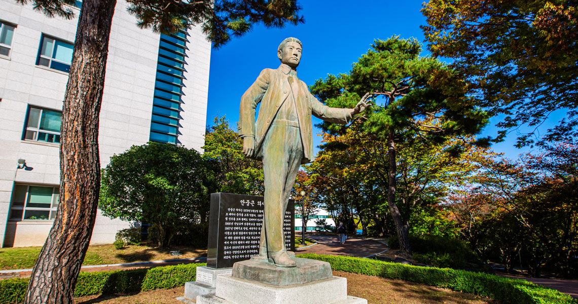 중앙도서관 광장에 있는 안중근 의사 동상은 안 의사의 숭고한 애국·애족 정신을 기리기 위해 2011년에 세워졌습니다.