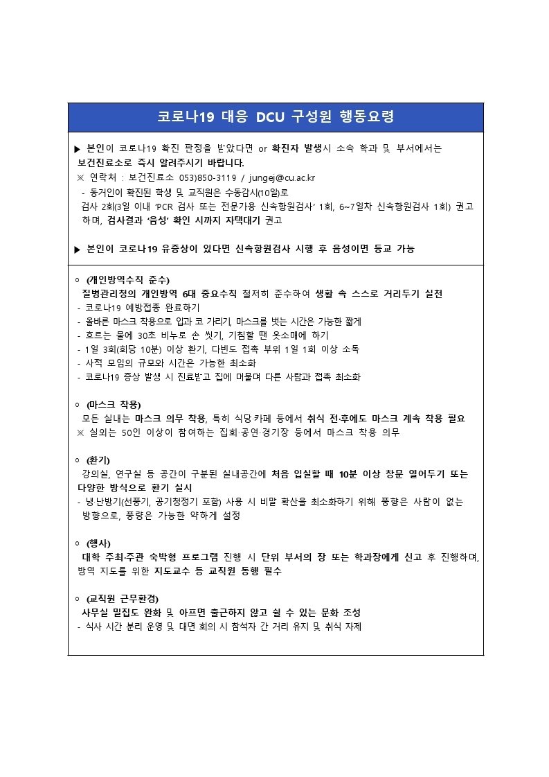 | 37 | 코로나19 대응 DCU 구성원 행동요령 안내(v7-1) | 보건진료소 | 2022/02/24 | 1693 | |