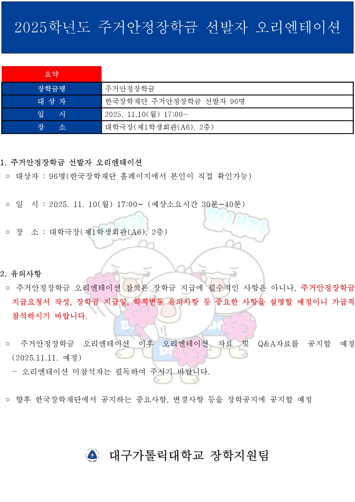 2025학년도 2학기 주거안정장학금 선발자 오리엔테이션 자료 공지